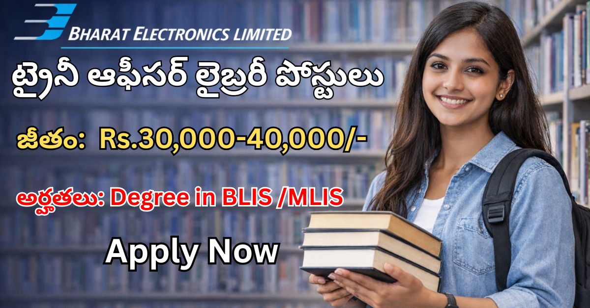 రక్షణ మంత్రిత్వ శాఖ పరిధిలోని ప్రముఖ పబ్లిక్ సెక్టార్ సంస్థ Bharat Electronics Limited (BEL) తాజాగా ట్రైనీ ఆఫీసర్ (లైబ్రరీ) పోస్టుల భర్తీకి నోటిఫికేషన్ విడుదల చేసింది. తాత్కాలిక ప్రాతిపదికన ఈ నియామకాలు చేపడుతున్నారు. ఆసక్తి మరియు అర్హత కలిగిన అభ్యర్థులు అధికారిక వెబ్సైట్ ద్వారా దరఖాస్తు చేసుకోవచ్చు. పోస్టు వివరాలు (Post Details): నెల జీతం వివరాలు (Salary Details): ట్రైనీ ఆఫీసర్గా ప్రారంభంలో 2 సంవత్సరాలపాటు నియామకం ఉంటుంది. ప్రాజెక్ట్ అవసరం మరియు